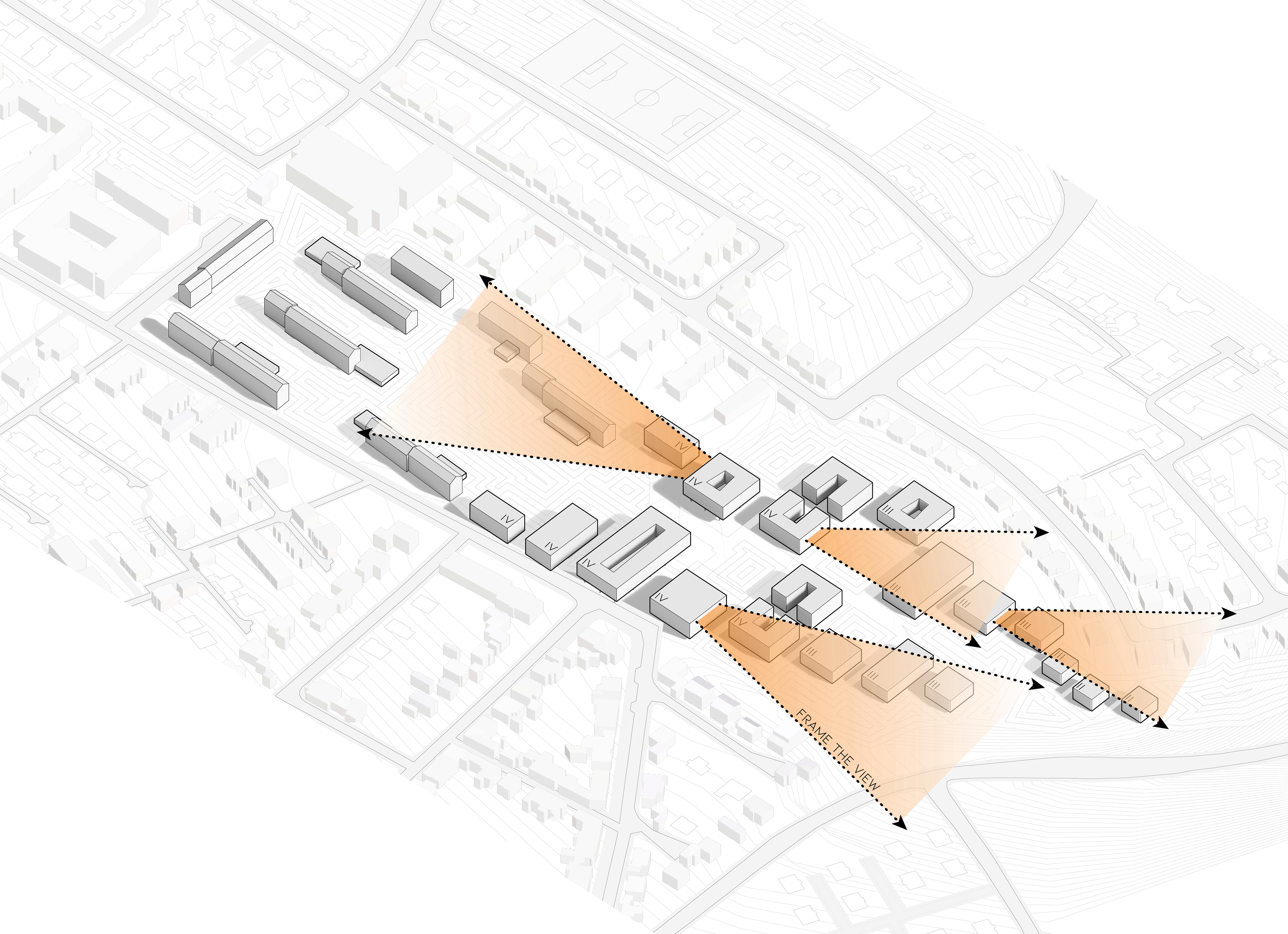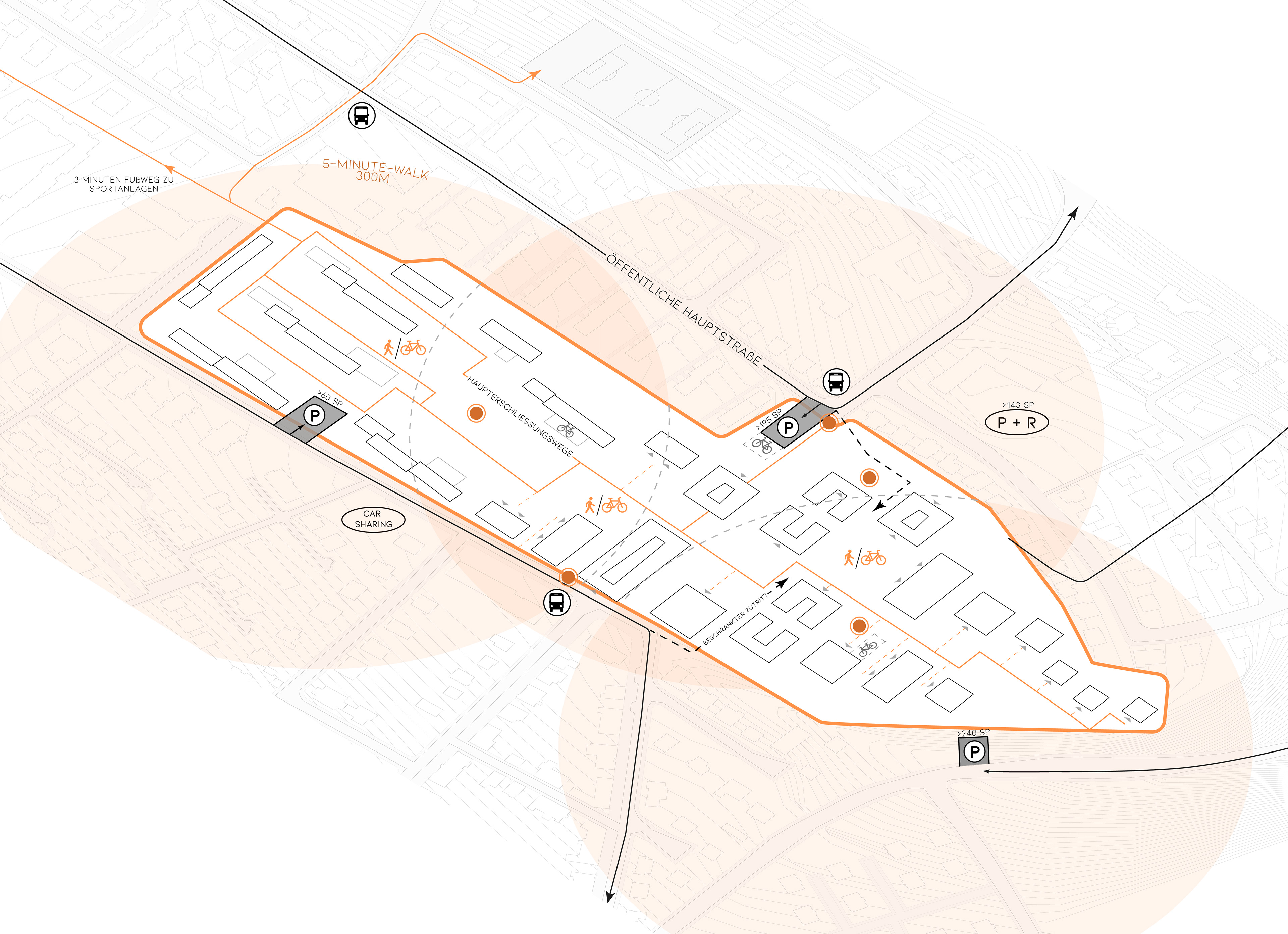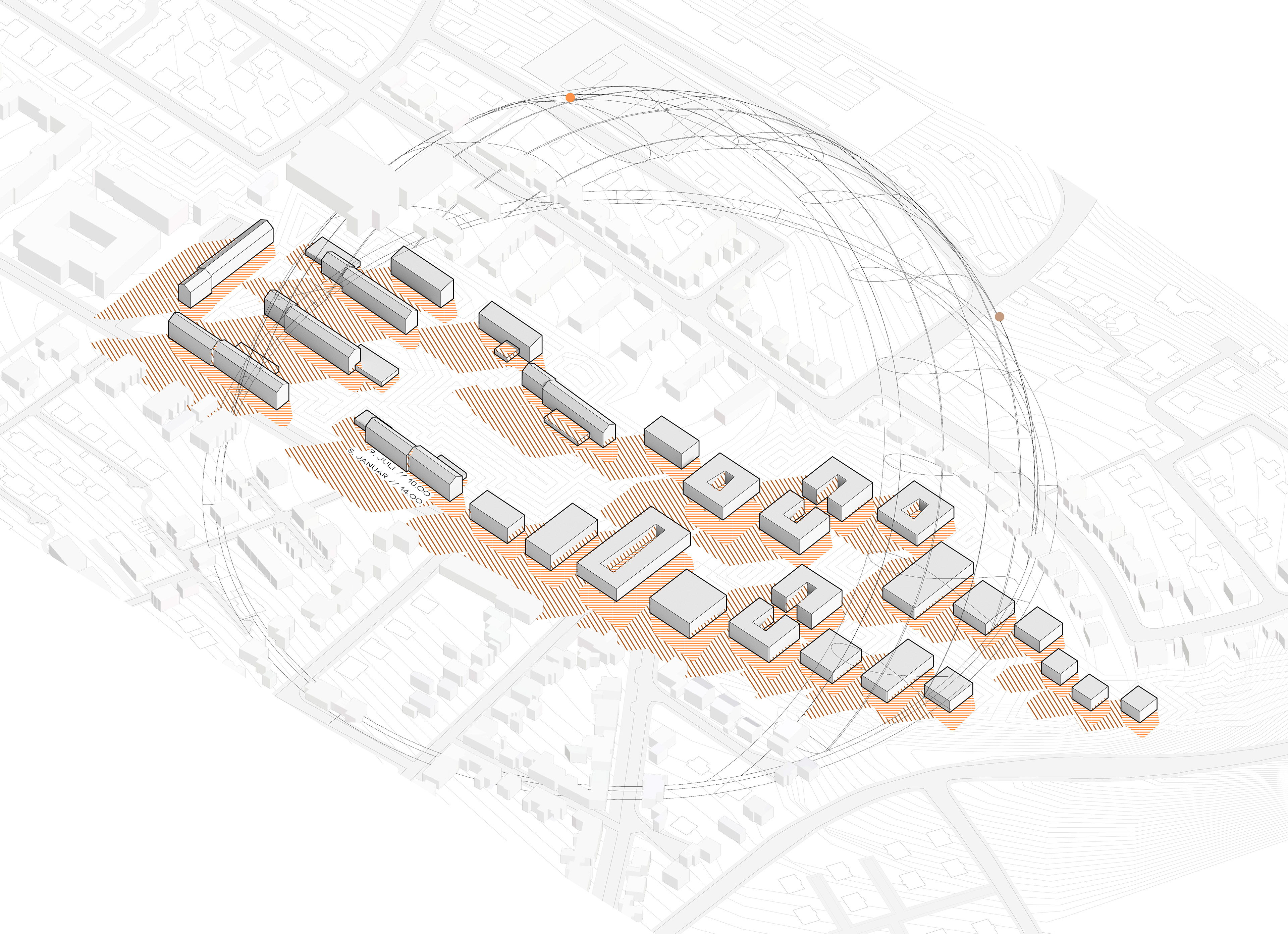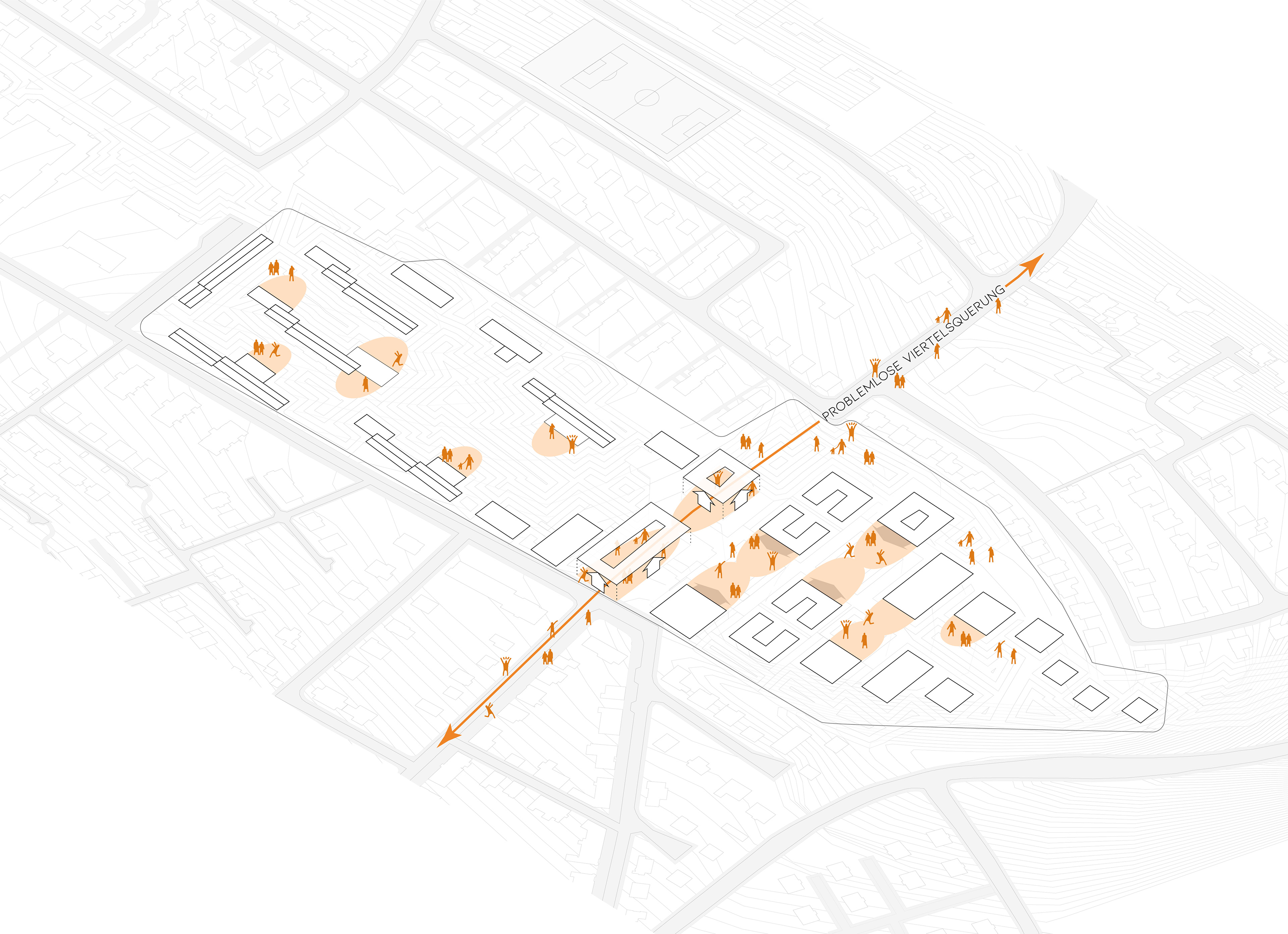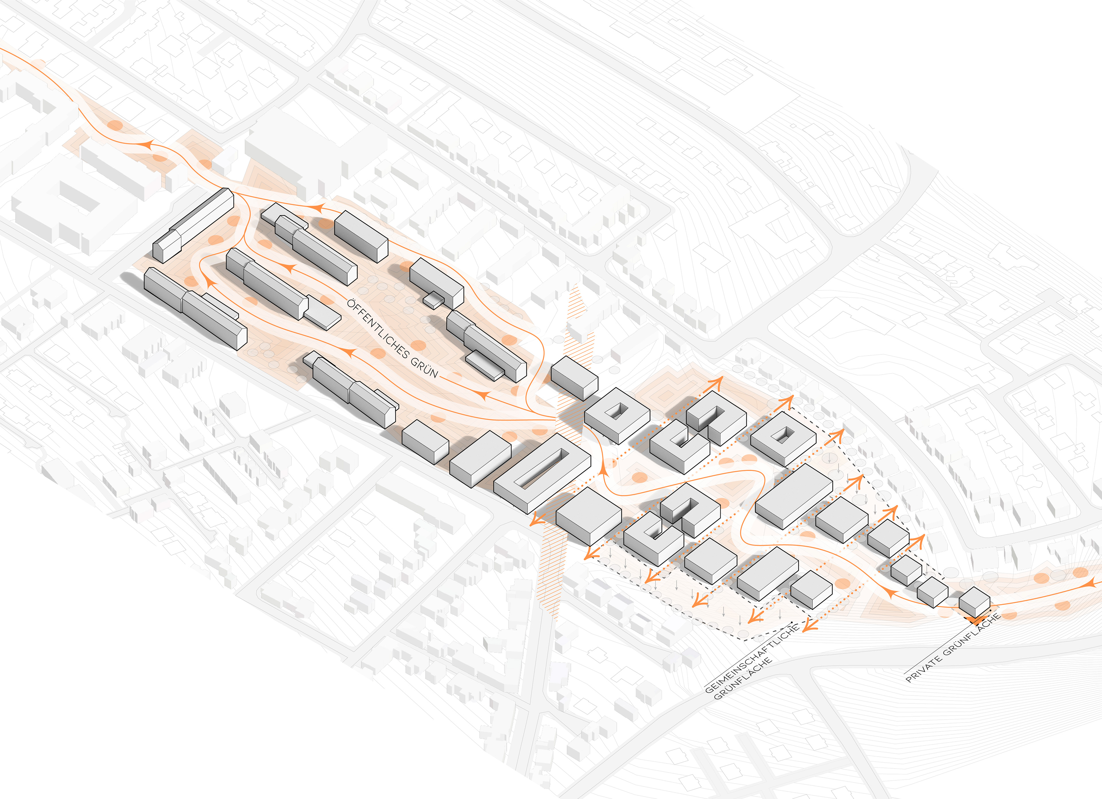 The historic axis is strengthened as the backbone of the complex by being graphically reflected in the outdoor surfaces. The‘passing axis’ to the north/east access remains for non-motorised traffic. The new quarter as a recognisable, independent cluster is contrasted to the ‘military’ austerity of the historic barracks building.