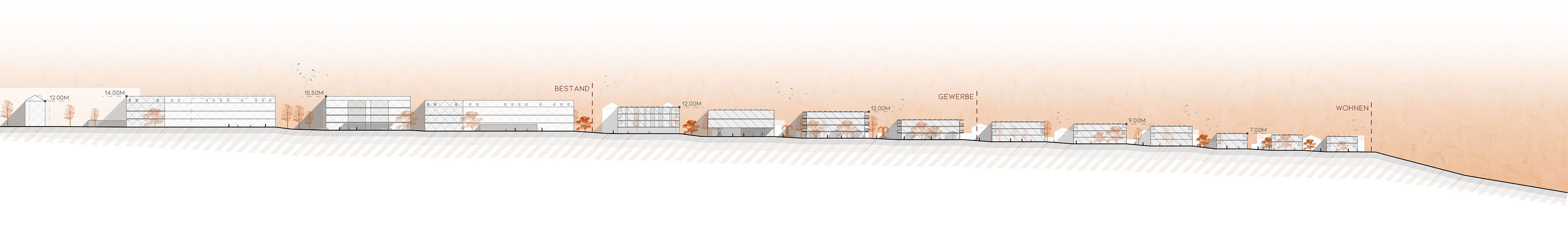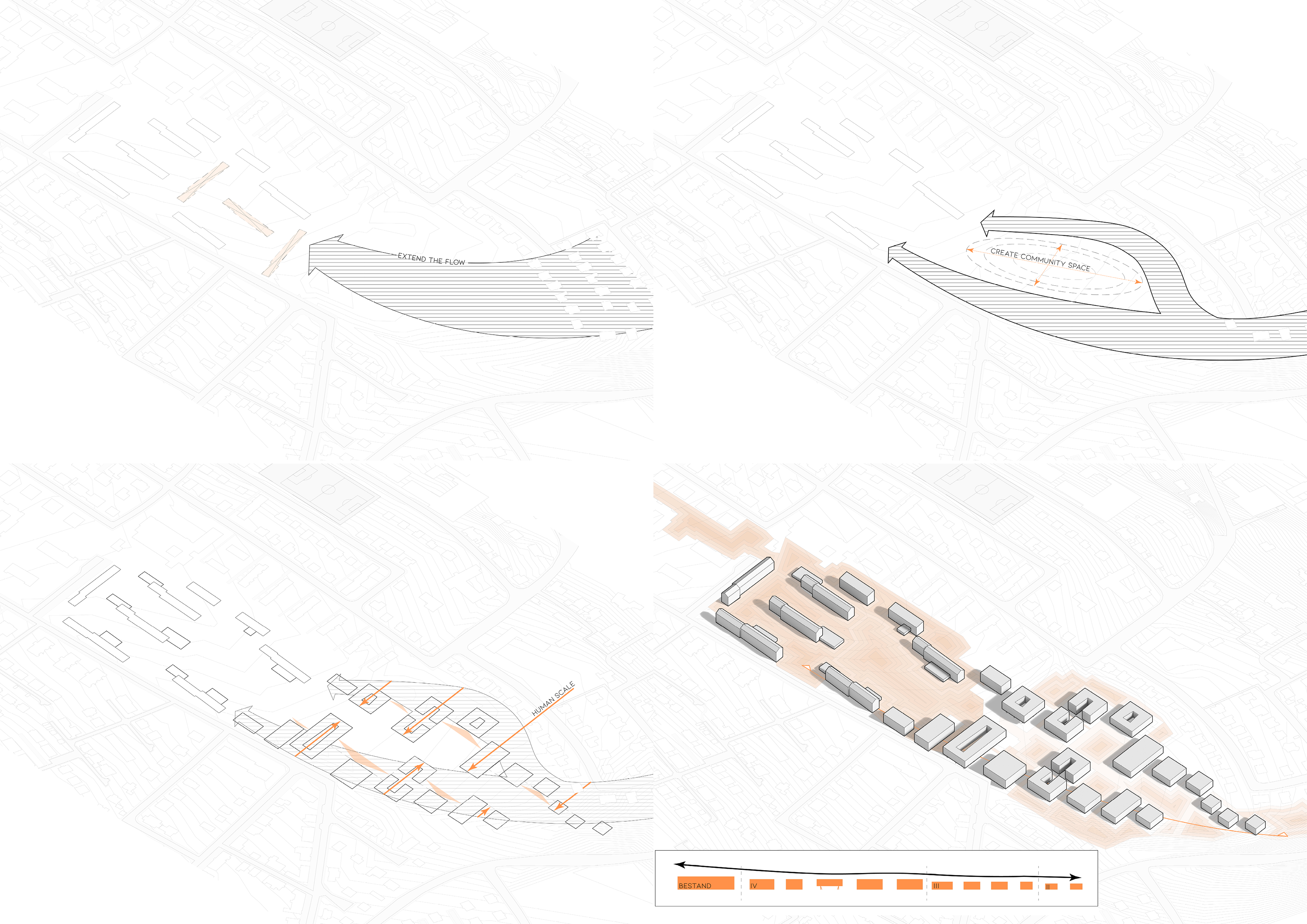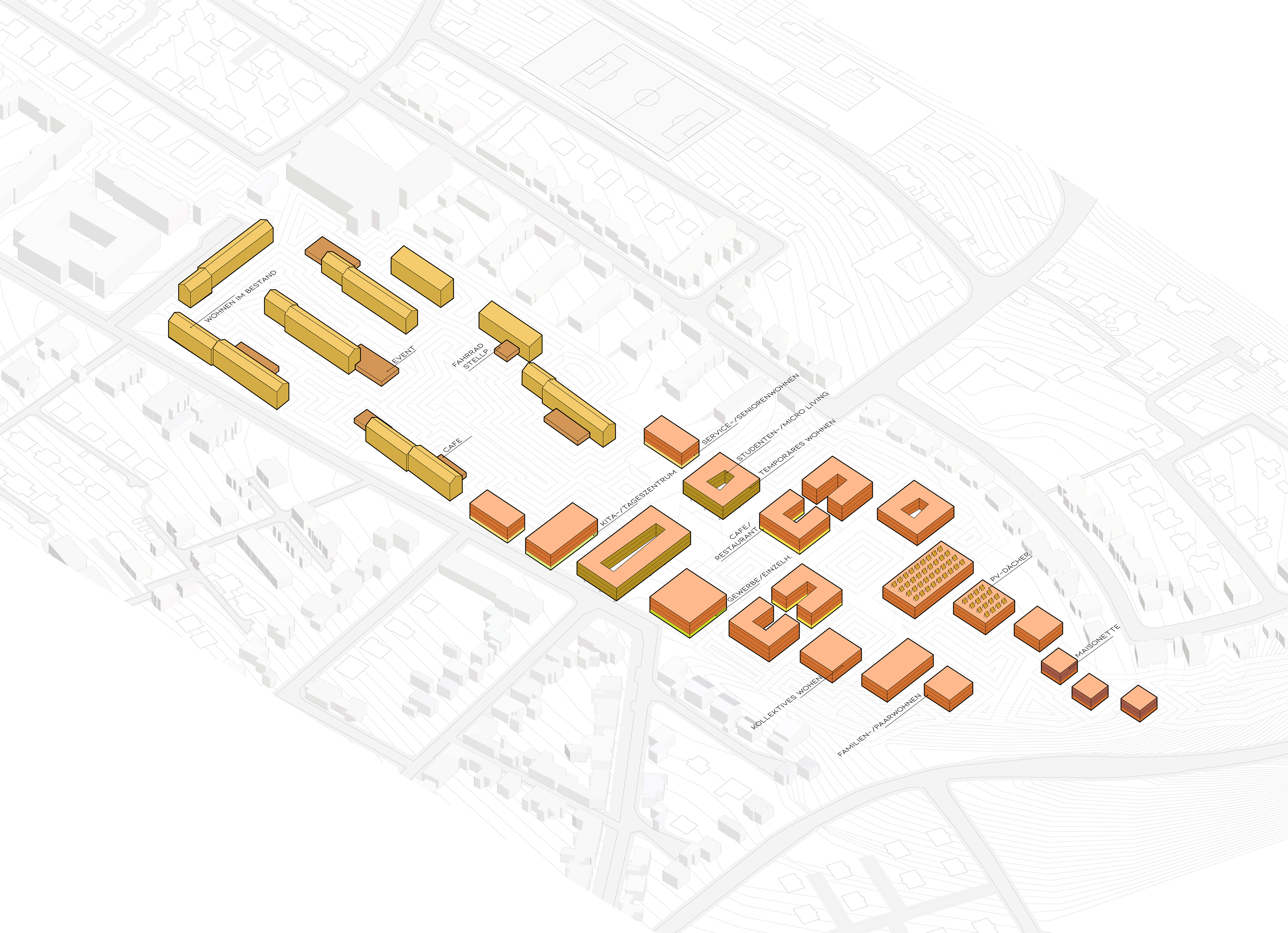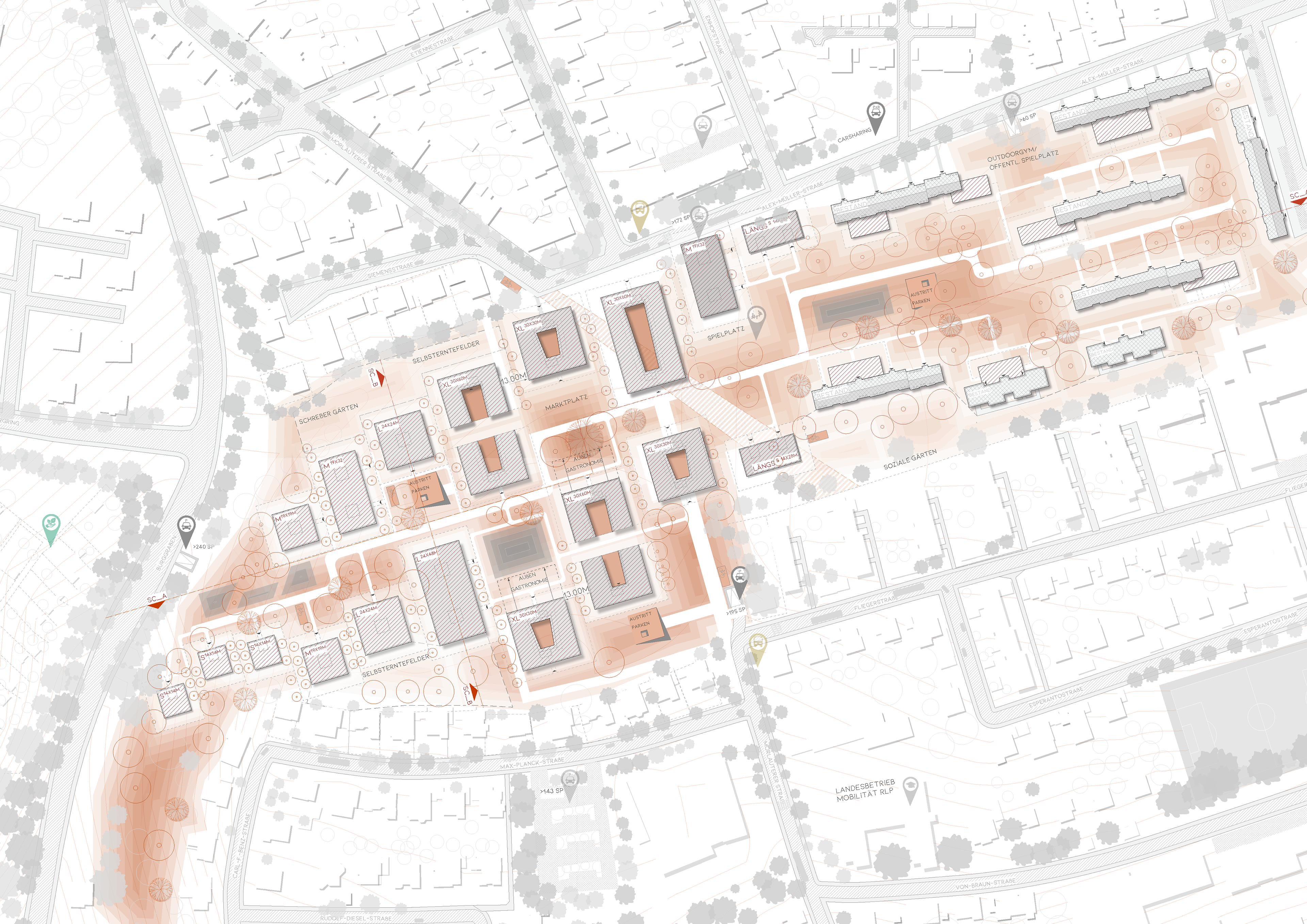 Special attention was paid to the transition from point typology to the barracks typology. Through a rhythmic interplay of rectangular rotated and point-shaped cubatures, a harmonious transition is created. The cluster forms manageable, identity-forming neighbourhoods for the future users. The neighbourhood squares are lively centres. North of the market square are small with shops, surgeries andcare service to counteract the lack of local amenities.The green centre provides with its recovery and retreat areas a new quality, which radiates into the immediate surroundings.